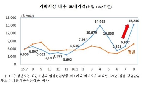배추 도매가격은 8월 초순 1만304원에서 중순 1만4082원, 하순 2만157원으로 증가한데 이어, 이달 1~6일엔 2만874원으로 급등했다. 최근 5년 평년 가격 대비로도 92.5% 상승을 나타냈다.