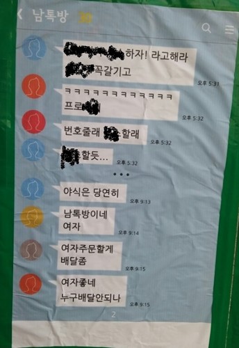 30명이 참여한 것으로 나오는 이 단톡방에서는 "여자 주문할게 배달 좀" "여자 좋네 누구 배달 안 되나" "맞선 여자 첫 만남에 XX해버려" 등 성희롱 대화 내용이 담겨있다.