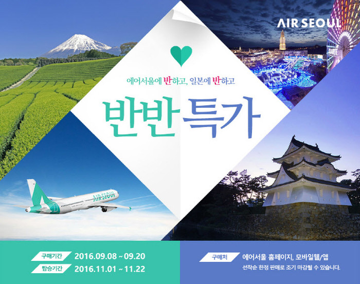 ‘반반 특가’(에어서울에 반하고 일본에 반하고 가격에 반하는) 이벤트는 오는 20일까지 진행되며, 선착순 한정 판매로 조기 마감될 수 있다.