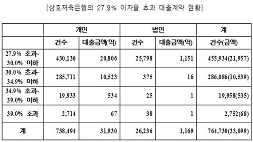 지난 3월 대부업법 개정으로 상호저축은행의 최고이자율이 27.9%로 인하됐으나 여전히 27.9%를 초과하는 이자가 적용되는 대출계약이 상당했다.