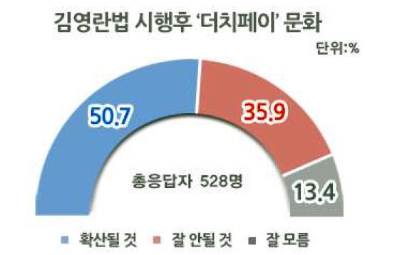 [일요주간=김청현 기자] 우리나라 국민 절반 가량은 김영란법 시행으로 더치페이 문화가 확산될 것이라고 생각하는 것으로 나타났다.