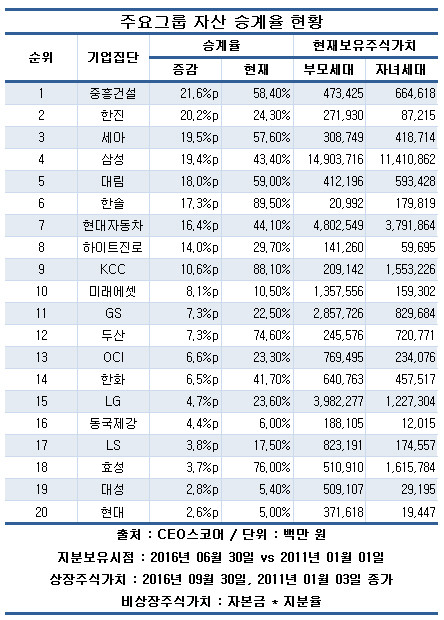 5일 기업 경영성과 평가사이트 CEO스코어가 오너가 있는 상위 50대 그룹 대주주 일가의 계열사 보유주식 승계율을 조사한 결과, 평균 32.7%로 조사됐다. 이는 2011년 초 28.7%에 비해 4.1%p 높아진 수치다.