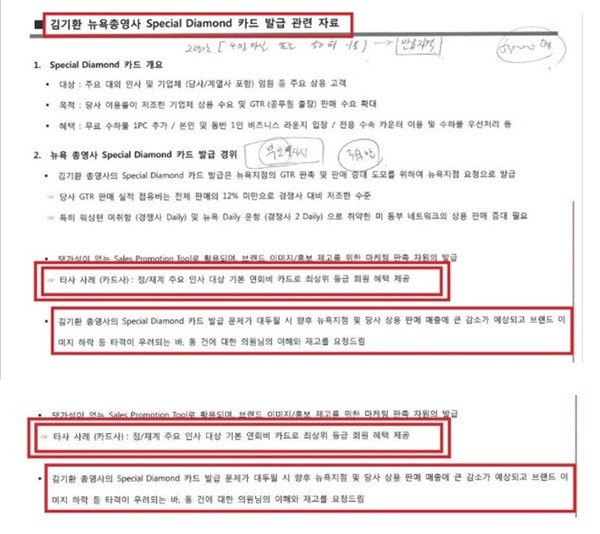 또 이 문건에는 ‘스페셜 다이아몬드 카드’의 대상을 주요 대외 인사 및 기업체 임원 등으로 지칭하고 있다. 즉 일반 고객이 아닌 VIP들을 대상으로 발급하는 카드인 셈이다.