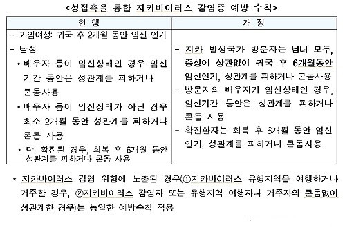 질병관리본부는 동남아시아 등 지카 발생국가 방문자는 증상 여부와 상관없이 남녀 모두 6개월간 성관계를 피하거나 콘돔을 사용하고 임신을 피할 것을 권고한다고 밝혔다. 최근 6개월 이내(4월10일~10월10일)에 발생국가를 여행한 사람도 포함된다.