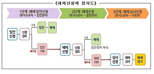 토지소유자가 해제를 신청하려면 입안신청서 등 서류를 작성해 지자체 등 입안권자에게 제출하면 된다. 입안신청이 들어오면 입안권자는 해당시설의 집행계획이 수립된 때 등 특별한 사유가 아니라면 해제를 입안해야 한다.