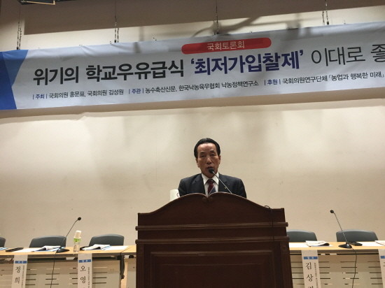 지난 26일 오후, 홍문표, 김성원 새누리당 의원의 주최로 서울 여의도 국회의원회관 2층 대회의실에서 ‘위기의 학교우유급식, 최저가입찰제 이대로 좋은가’ 토론회가 개최되었다.