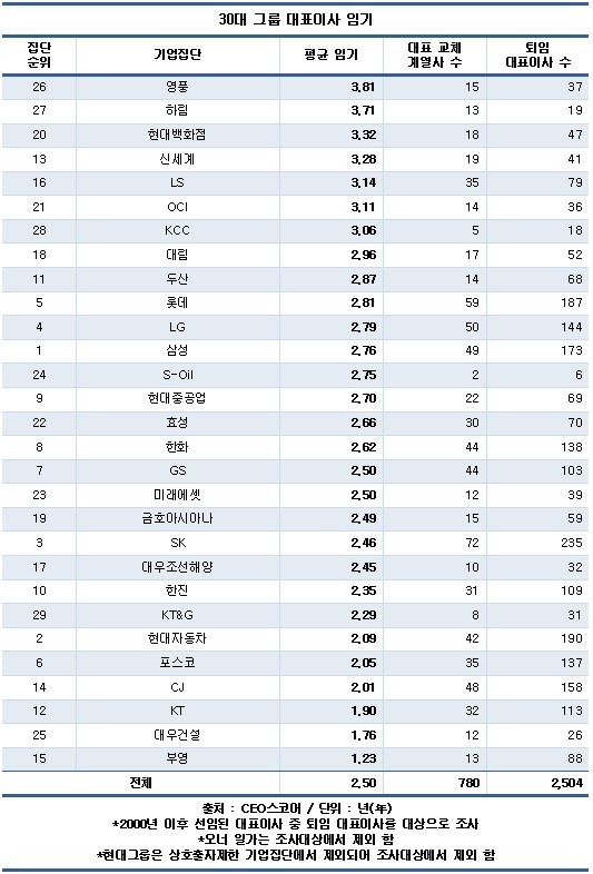 9일 기업경영성과평가 사이트 CEO스코어에 따르면 2000년 이후 16년간 30대 그룹 계열사에서 대표이사로 재직한 최고경영자급 임원 2504명의 임기를 조사한 결과 2.50년으로 나타났다.