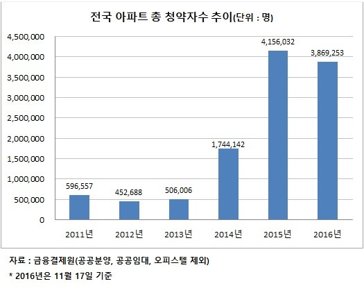 21일 부동산전문리서치업체 리얼투데이가 금융결제원 자료를 분석한 결과, 11월 17일 현재 전국 아파트 총 청약자수는 386만9253명(공공분양, 공공임대, 오피스텔 제외)이다. 400만명까지는 13만747명 모자란 수치다.