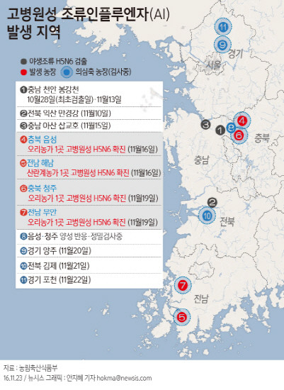 23일 현재까지 전남 해남(산란계), 충북 음성(오리), 전남 무안(오리), 충북 청주(오리) 지역 4개 농장에서 고병원성 AI가 확진됐다. 경기 양주(20일), 전북 김제(21일), 포천(22일)의 의심축 신고건에 대해서는 정밀검사 중이다.