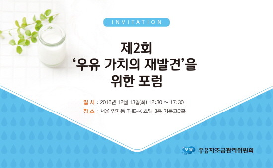 [일요주간=노현주 기자] 우유자조금관리위원회(위원장 이승호)가 우유 포럼을 개최한다. 12월 13일 화요일 서울 양재동 THE-K 호텔 3층 거문고 C홀에서 제2회 ‘우유 가치의 재발견을 위한 포럼’이 진행될 예정이다.