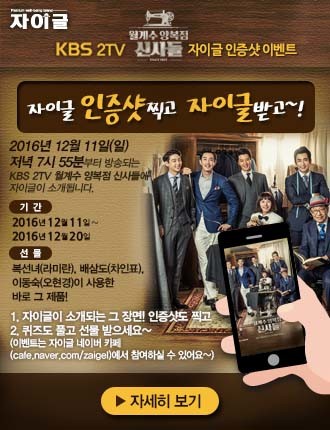 웰빙 아이디어기업 자이글㈜(대표이사 이진희)은 KBS2TV의 주말 인기드라마 ‘월계수 양복점 신사들’ 협찬을 기념해 자이글 공식 카페에서 11일부터20일까지 자이글 인증샷 이벤트를 진행한다고 밝혔다.