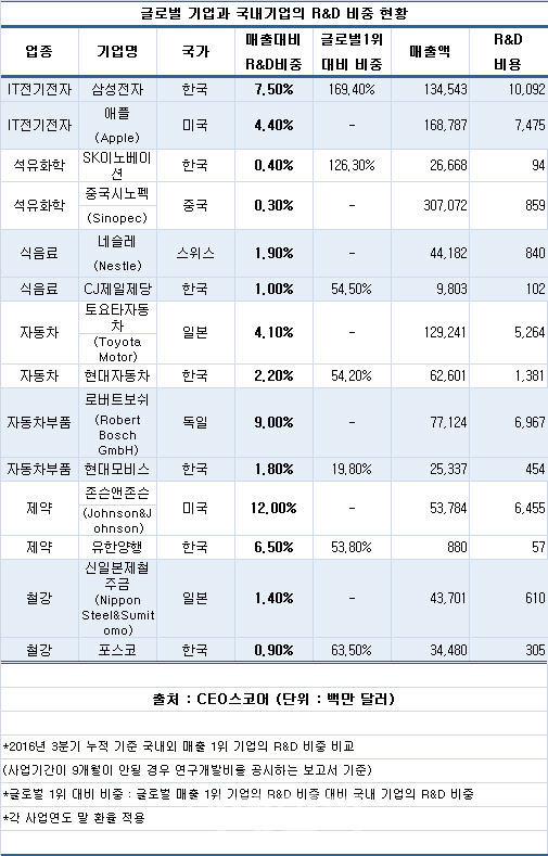 28일 기업 경영성과 평가사이트 CEO스코어가 7개 업종별 국내 10대 기업의 올해 3분기 말 기준 매출 대비 R&D 비중을 조사한 결과, 글로벌 톱 10 기업의 76.1% 수준에 그친 것으로 조사됐다. 2015년 3분기 말의 74.0%에 비하면 소폭 상승했지만 글로벌 기업들에 비해서는 여전히 인색한 수준이다.