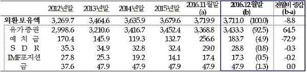 한국은행이 4일 발표한 ‘2016년 12월말 외환보유액’에 따르면 지난달 외환보유액은 3711억달러로 전월말(3718억9000만달러) 대비 8억8000만달러 감소했다.