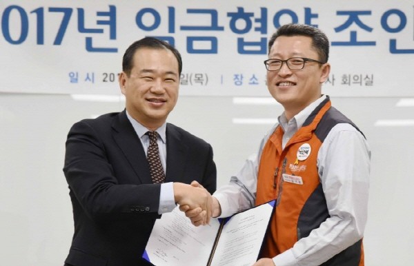 | ▲ 홈플러스㈜ 노사는 김상현 사장(왼쪽)과 김기완 노조위원장(오른쪽)이 참석한 가운데 5일 서울 강서구 등촌동 홈플러스 본사에서 2017년 임금협약 조인식을 가졌다. | ||