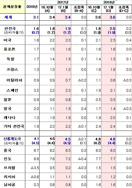 IMF는 “세계경제는 선진국과 함께 중국 등 신흥개도국의 성장세 개선에 힘입어 2017년 및 2017년에 회복세를 시현할 전망”이라며 “다만, 이번 전망은 미국 트럼프 정부의 정책기조 변화에 따라 다소 유동적일 수 있다”고 설명했다.
