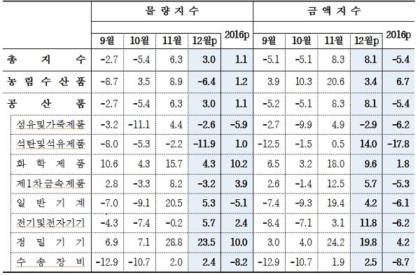한편, 지난해 12월 수출물량지수는 145.72로 지난해 같은 기간 보다 3.0% 오르면서 2개월 상승했다.