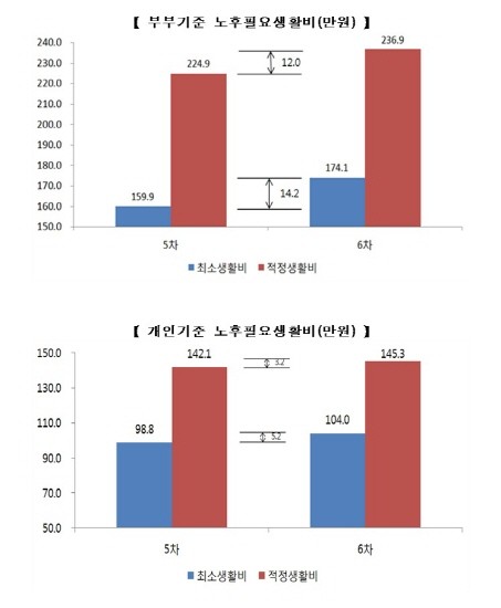 또 50대 이상이 인식하는 월평균 최소생활비는 부부 기준 174만1000원, 개인 기준 104만원이었다.