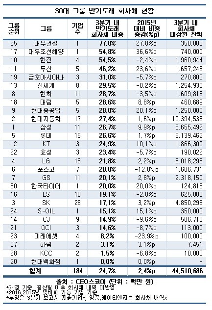 1일 기업경영성과 평가사이트 CEO스코어가 30대 그룹 계열사 중 사업보고서를 제출한 184개 기업의 회사채 현황을 조사한 결과 작년 9월 말 기준 회사채 잔액 180조2256억원 중 24.7%인 44조5107억원이 오는 9월 이전에 만기도래하는 것으로 나타났다.