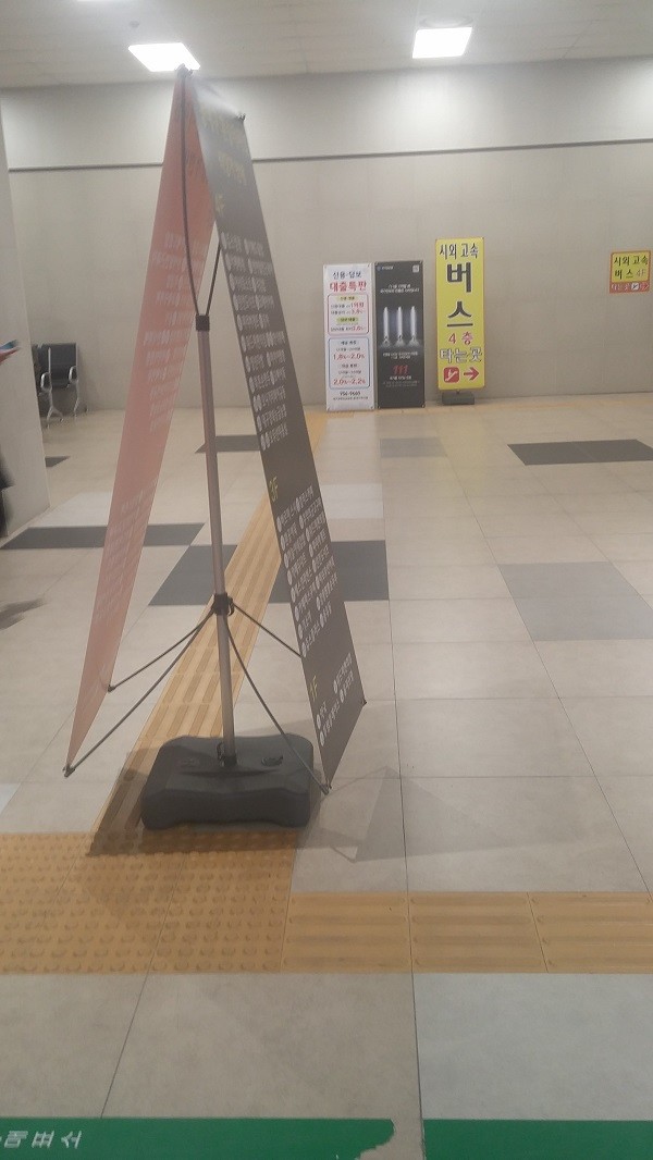 아울러 백화점 내에서 엘리베이터를 이용하지 않고는 복합환승센터로 자유롭게 이동할 수 없는 구조로 이뤄졌으며, 화분과 소화기 등이 점자블록 안내줄에 비치돼 있는 등 장애인에 대한 보호시설 관리에 허점이 많다는 지적이다.