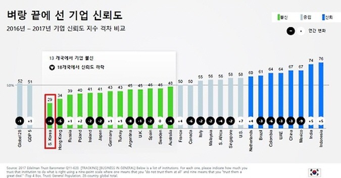8일 국제 홍보컨설팅 회사 에델만코리아가 여론 주도층 200명을 포함한 한국인 1150명을 대상으로 한 조사 결과, 한국 기업에 대한 신뢰도는 29%로 나타났다.