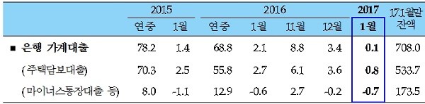 9일 한국은행이 발표한 ‘2017년 1월중 금융시장 동향’에 따르면 지난달 말 은행 가계대출(정책모기지론 포함) 잔액은 708조원으로 전월 대비 1000억원 증가했다.