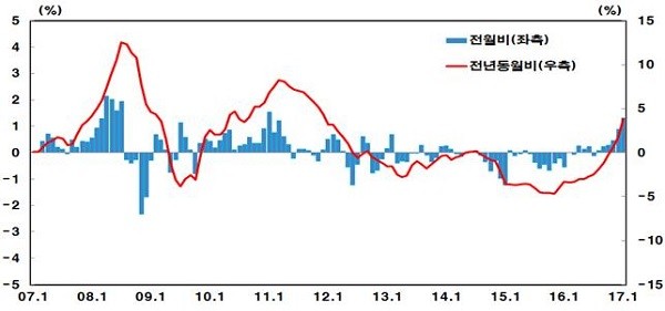 20일 한국은행이 발표한 '2017년 1월 생산자물가지수'에 따르면 지난달 생산자물가지수(2010=100 기준)는 102.17로 전월 대비 1.3%, 전년 동월 대비로는 3.7% 상승했다.