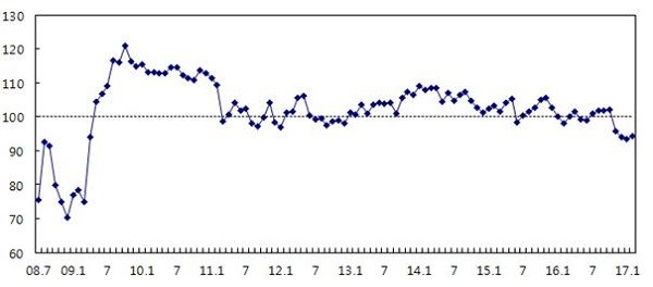 24일 한국은행이 발표한 '2017년 2월 소비자동향조사 결과'에 따르면 소비자심리지수(CCSI)는 전월 대비 1.1p 오른 94.4를 기록했다.