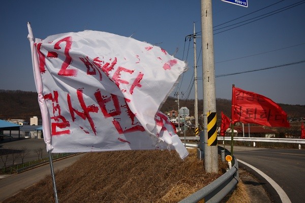 | ▲ K2·대구공항 통합 이전을 위한 예비후보지로 선정된 경북 군위군 우보면 소재지 도로변에 'K2 비행단 결사반대' '김영만 군수는 사퇴하라' 등의 문구가 적힌 플래카드가 걸려 있다. | ||