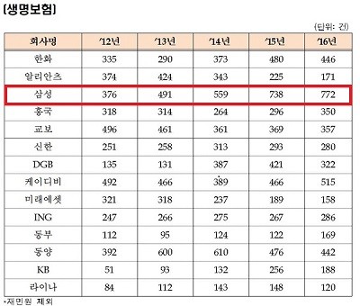특히 생보사 중 민원이 가장 많은 곳은 삼성생명인 것으로 나타났다. 최근 5년 동안 생보사를 살펴보면 삼성생명에서 2,936건의 민원이 발생했으며 동양생명 (2520건), KDB생명(2328건), 교보생명(2044건), 한화생명(1924건)이 그 뒤를 이었다.