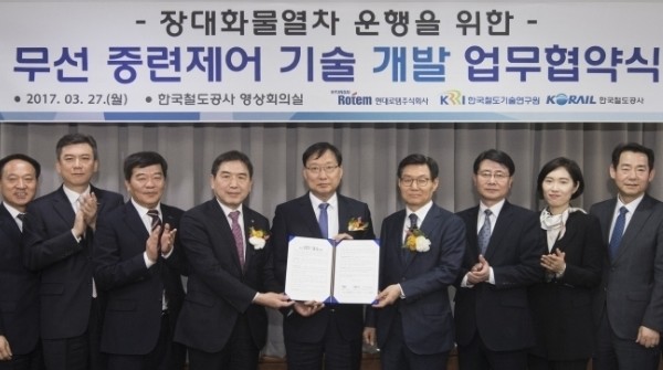현대로템은 27일 코레일 본사에서 홍순만 코레일 사장, 김기환 한국철도기술연구원(이하 철도연) 원장, 김승탁 현대로템 사장 등 관계자들이 참석한 가운데 장대 화물열차 운행을 위한 무선 중련제어 기술 개발 업무협약을 체결했다고 28일 밝혔다.