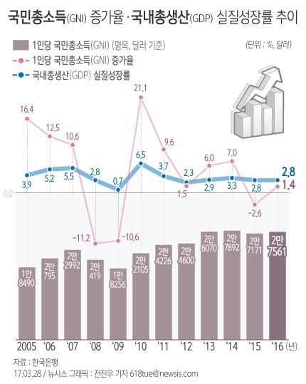 28일 한국은행이 발표한 '2016년 국민계정(잠정)'에 따르면 지난해 우리나라의 1인당 GNI는 2만7561달러로 전년(2만7171 달러) 대비 1.4% 증가했다.