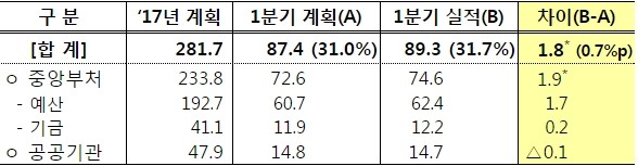 [일요주간=김바울 기자] 정부의 1분기 재정집행 실적은 작년 말 ‘2017 경제정책방향’에서 세운 목표인 87조4000억원 대비 1조8천억원 초과한 89조3천억원(31.7%)으로 나타났다. 지방재정 및 지방교육재정도 각각 집행목표를 초과달성했다.