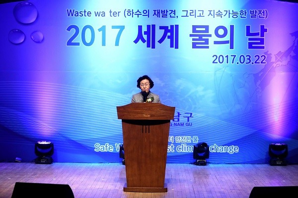 | ▲ 신연희 강남구청장이 22일 서울 강남구민회관에서 열린 ‘세계 물의 날 기념행사’에 참석해 인사말을 하고 있다.(사진=강남구청 제공) | ||