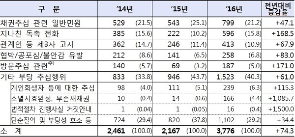 또한 소멸시효 완성 채권 추심 등 기존에는 많지 않았던 개인회생․파산자에 대한 추심(239건), 소멸시효 완성 채권 또는 부존재 채권에 대한 추심(166건) 등 불법ㆍ부당채권추심 유형이 전년대비 126건에서 421건으로 크게 증가했다.