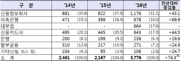 권역별로는 신용정보회사에 이어 저축은행(18.0%), 대부업(17.6%), 신용카드사(17.0%) 등으로 나타났다.