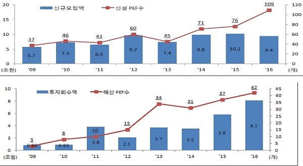 지난해 말 기준, 경영참여형 사모집합투자기구(PEF)는 총 383사로 자본시장법이 시행된 지난 2009년 110사 대비 3.5배 성장했다.