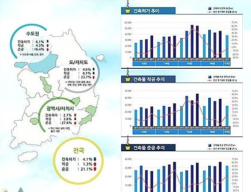 전년 동기 대비 아파트 건축물의 허가(△13.2%) 면적은 감소했으나, 착공(6.9%), 준공(45.6%) 면적은 오히려 증가했다.