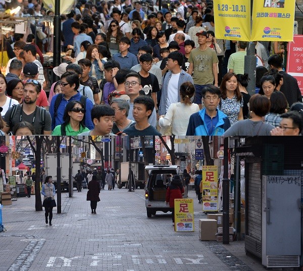 | ▲ 주한미군 사드 한국 배치와 관련, 중국 당국의 한국 단체 관광 금지 조치와 중국 소비자의 날을 하루 앞두고 중국인 관광객이 급격하게 감소하고 있다. 사진 위는 지난해 10월 중국 국경절 연휴기간에 열린 '코리아 세일 페스타' 기간에 명동거리를 찾은 중국인 관광객들의 모습. 사진 아래는 14일 서울 명동거리의 모습이다. | ||