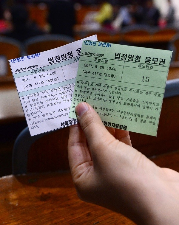 법원은 사회적 관심이 높은 사건에 대해 일반 국민에게 평등하게 방청 기회를 제공하려고 사전에 방청 희망자 응모를 받아 추첨으로 방청권을 배부한 것이다.