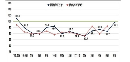 한국경제연구원이 매출액 기준 600대 기업을 대상으로 실시한 기업경기실사지수 조사 결과, 6월 전망치는 99.1을 기록했다. 이는 전월에 비해 7.4포인트 상승한 것으로 작년 5월 102.3 이후 최고치를 기록했다.