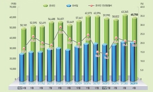 통계청이 2일 발표한 ‘4월 온라인쇼핑 동향’에 따르면 4월 온라인쇼핑 거래액은 6조750억원으로 전월 대비 4.1% 감소했다. 모바일쇼핑 거래액 역시 전월보다 1.5% 감소한 3조6819억원으로 집계됐다. 온라인쇼핑 거래액 중 모바일이 차지하는 비중은 60.6%로 처음 60%대를 돌파했다.