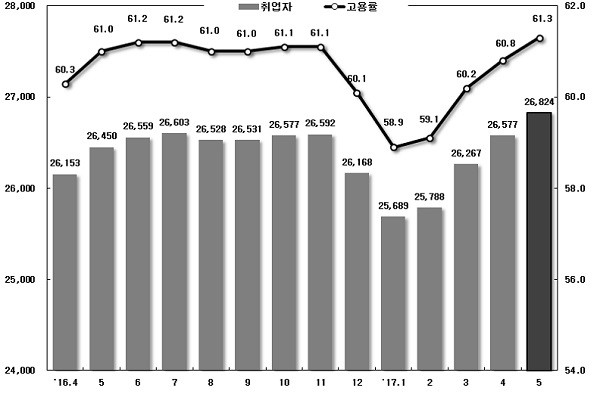 3~4월 취업자 수 증가폭이 40만명대를 기록한 데 이어 양호한 흐름을 이어갔다. 고용률은 61.3%를 기록해 지난해에 비해 0.3%p 상승했다.