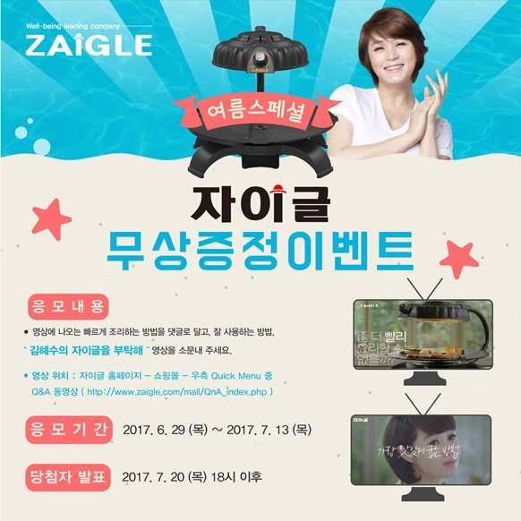 이번 이벤트는 “김혜수의 자이글을 부탁해“ 영상을 통해 자이글 사용에 대한 올바른 정보를 전달하여 고객들의 만족도를 높이고자 기획되었다. 영상에는 조리시간이나 전기소모량 등 고객들이 자이글에 대해 가장 궁금해하는 질문에 대한 답과, 식재료에 따라 가장 맛있고 빠르게 요리할 수 있는 다양한 사용팁이 담겨있다.