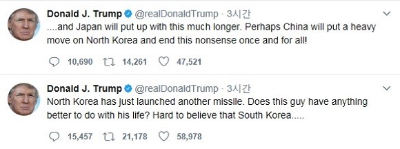 이어 트럼프는 “한국과 일본이 이것을 더 견뎌야 한다는 것이 믿기지 않는다”며 “아마도 중국이 북한을 더 압박해 이 말이 안되는 상황을 완전히 끝낼 것”이라고 덧붙였다. 중국이 대북 제재 강화를 요구하는 기회로 북한의 추가 탄도미사일 발사를 삼은 것이다.