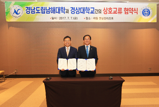 [일요주간=정병기 기자]국립 경상대학교(GNUㆍ총장 이상경)와 경남도립남해대학(총장 홍덕수)는 지난 7월 7일 오전 11시께 하동 켄싱턴리조트에서 교육역량 제고와 상호 발전을 위하여 협약을 체결했다.