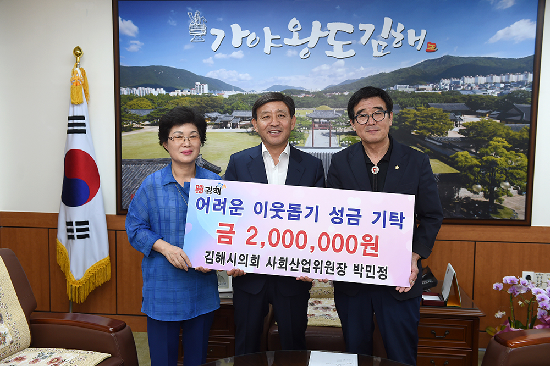 [일요주간=정병기 기자]박민정 김해시의회 사회산업위원장이 7월 13일 김해시청을 방문하여 관내 어려운 이웃을 위해 뜻깊게 사용해달라며 성금 2백만원을 김해시에 기탁했다.