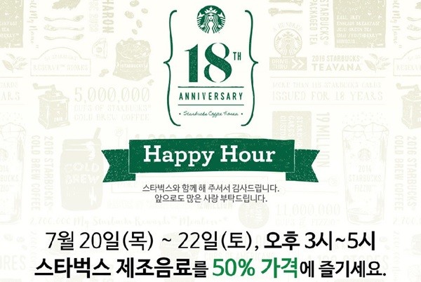 스타벅스커피코리아는 오는 20일부터 22일까지 3일간 오후 3시부터 5시까지 2시간 동안 전국 1050여개 매장(오션월드점, 오션월드입구점, 설악워터피아점, 마장휴게소점, 인천공항중앙점, 인천공항입국점, 인천공항랜드점, 인천공항출국점 제외)에서 고객 감사 해피아워 이벤트를 실시하며 음료를 50% 할인된 가격으로 판매한다.