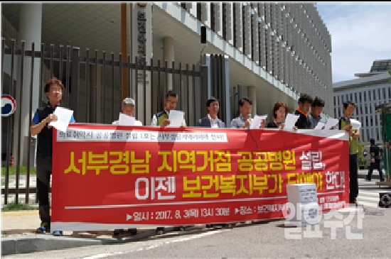 [일요주간=정병기 기자]지난 7월 4일 서부경남 지역 65개 단체가 참여해 함께 하고 있는 ‘서부경남 공공병원 설립 도민운동본부(공동상임대표 강수동 · 최세현, 이하 도민운동본부)는 8월 3일 13시 30분께 보건복지부 앞에서 기자회견을 가진 후 14시부터 도민운동본부와 보건복지부 간의 면담을 진행했다.고 밝혔다.