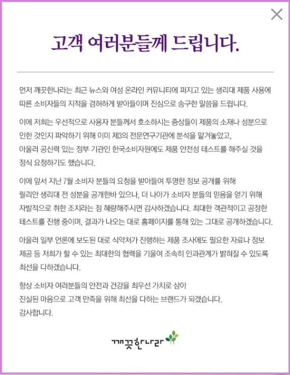 깨끗한나라는 이날 홈페이지에 생리대 논란과 관련해 “이미 제3의 전문연구기관에 분석을 맡겨놓았다”면서 “아울러 공신력 있는 정부 기관인 한국소비자원에도 제품 안전성 테스트를 정식 요청했다”고 밝혔다.