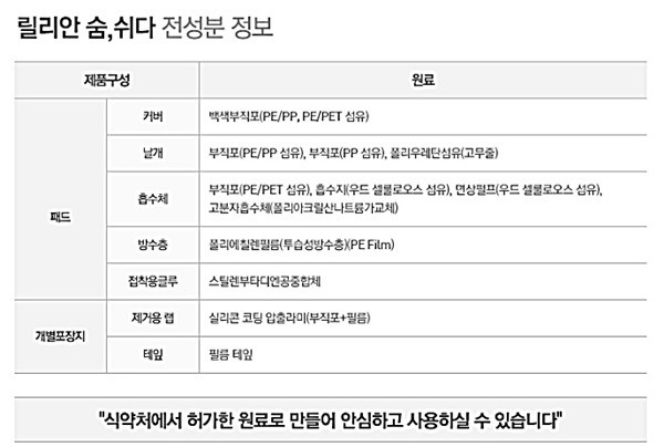 이어 “앞서 지난 7월, 소비자 분들의 요청을 받아 이미 투명한 정보 공개를 위해 릴리안 생리대의 전 성분을 공개한바 있다”면서 “소비자의 믿음을 얻기 위한 자발적 조치”라고 덧붙였다.